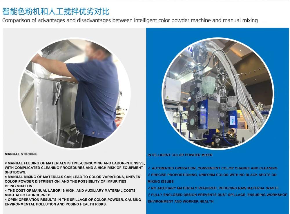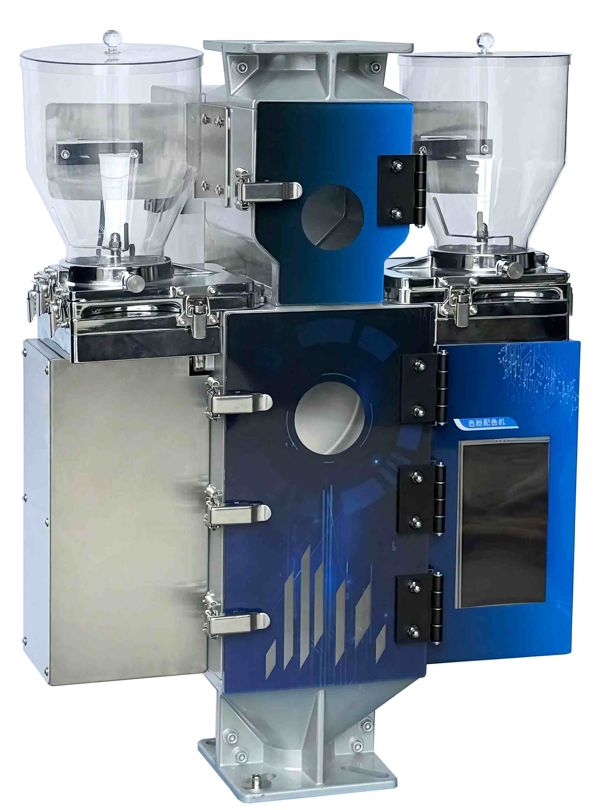 100 кг/год«Інтелектуальне змішування кольорових порошків» можна легко інтегрувати з централізованими системами подачі, центральними системами транспортування та автоматичними системами обробки матеріалів. Пластиковий кольоровий міксер оснащений високоточними датчиками зважування, що забезпечує рівномірність процесу змішування і консистенцію кольору, а також підтримує автоматичне дозування багатокомпонентних порошків і добавок.